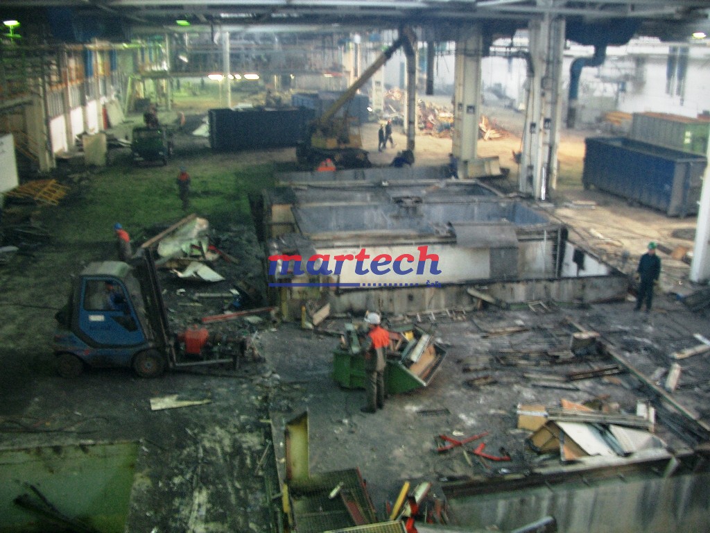 Complex removal of technology, including hazardous waste and remaining hazardous chemicals. After cleaning, only the hall and the utility networks remained, including hall lighting (approx. 1,200t of iron scrap. 1,800 m3 of hazardous waste). Liquidation time approx. 30 days (area approx. 20,000 m2).